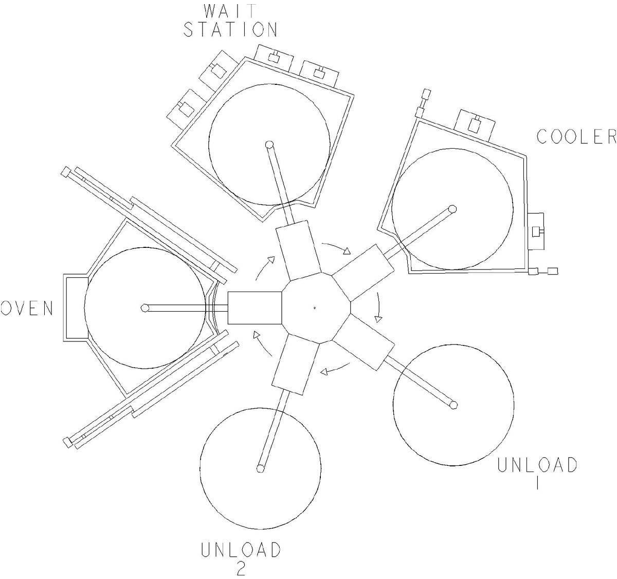 Carousel style machines (Fig 5) feature discrete locations for the oven, cooler and servicing station. Additional locations may be available: a “wait station” between oven and cooler and multiple servicing stations. Moulds are mounted on arms which move from location to location around a central spindle. The number of separate arms provided will depend on process constraints related to the types of products being manufactured.