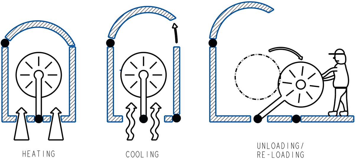 In a clamshell machine (Fig 7), all operations are carried out within the same envelope. There is only one arm, which goes through its cook cycle in an oven which is subsequently used as a cooler, once the burner is shut off. At the end of the cooling cycle, the arm articulates out of the front of the machine for servicing. Clamshell machines offer maximum process flexibility (cook, cool and service cycles can all be different from each other), but productivity is low compared to other types.