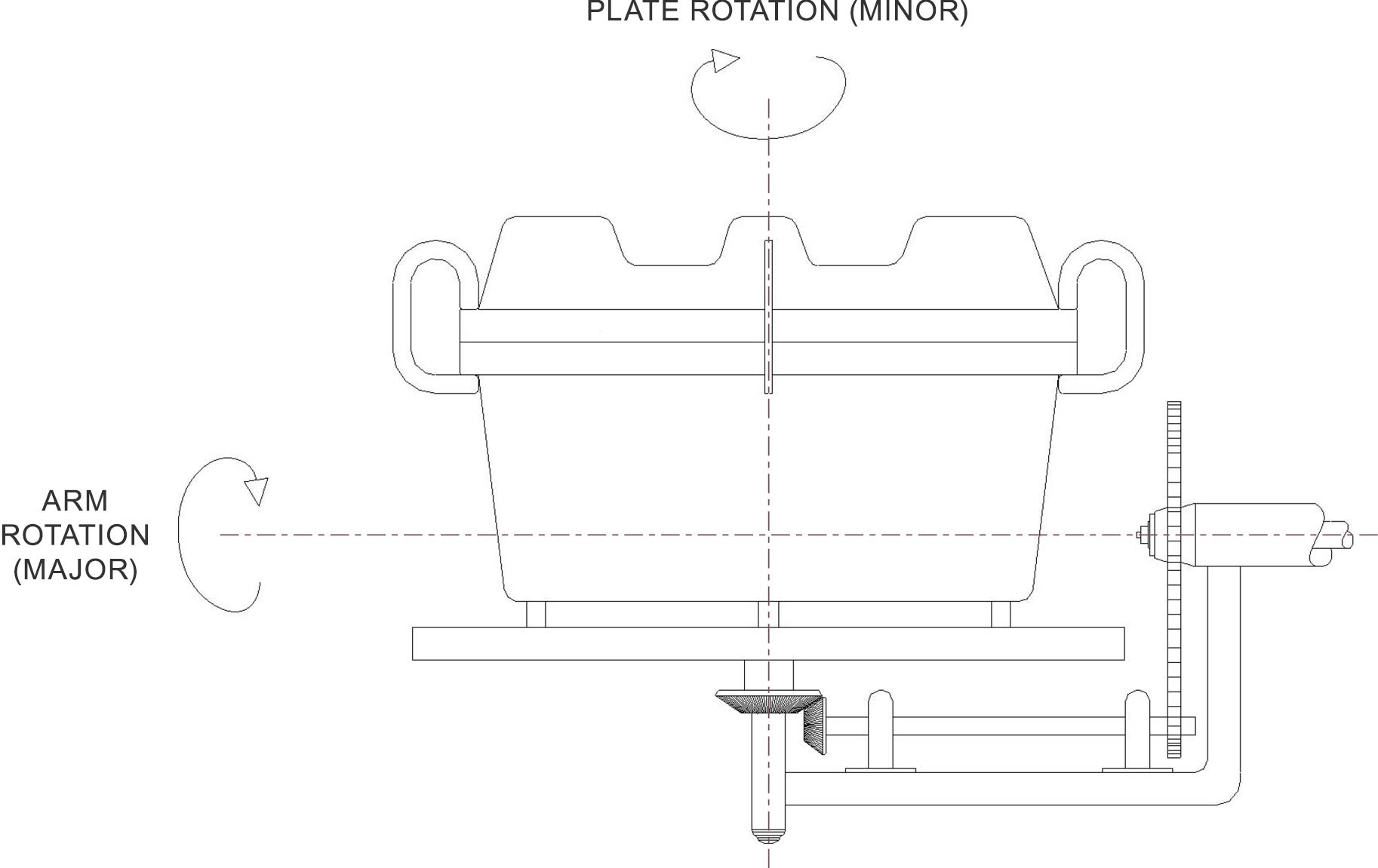 Biaxial motion is most commonly achieved using a straight arm which is a hollow tube with another driving shaft inside it; the arm components can be driven at separate rotation speeds by individual motors. A gear arrangement at the end of the arm converts the inner shaft rotation into a motion at 90°, which drives a circular plate on each side. In this arrangement (a “straight” arm), there can be molds mounted on either side of the arm. In order to accommodate very large molds, the arm can be cranked to make a so-called “offset” arm, in which case there is only one plate provided. This arrangement makes maximum use of the oven’s size. See Fig 8.