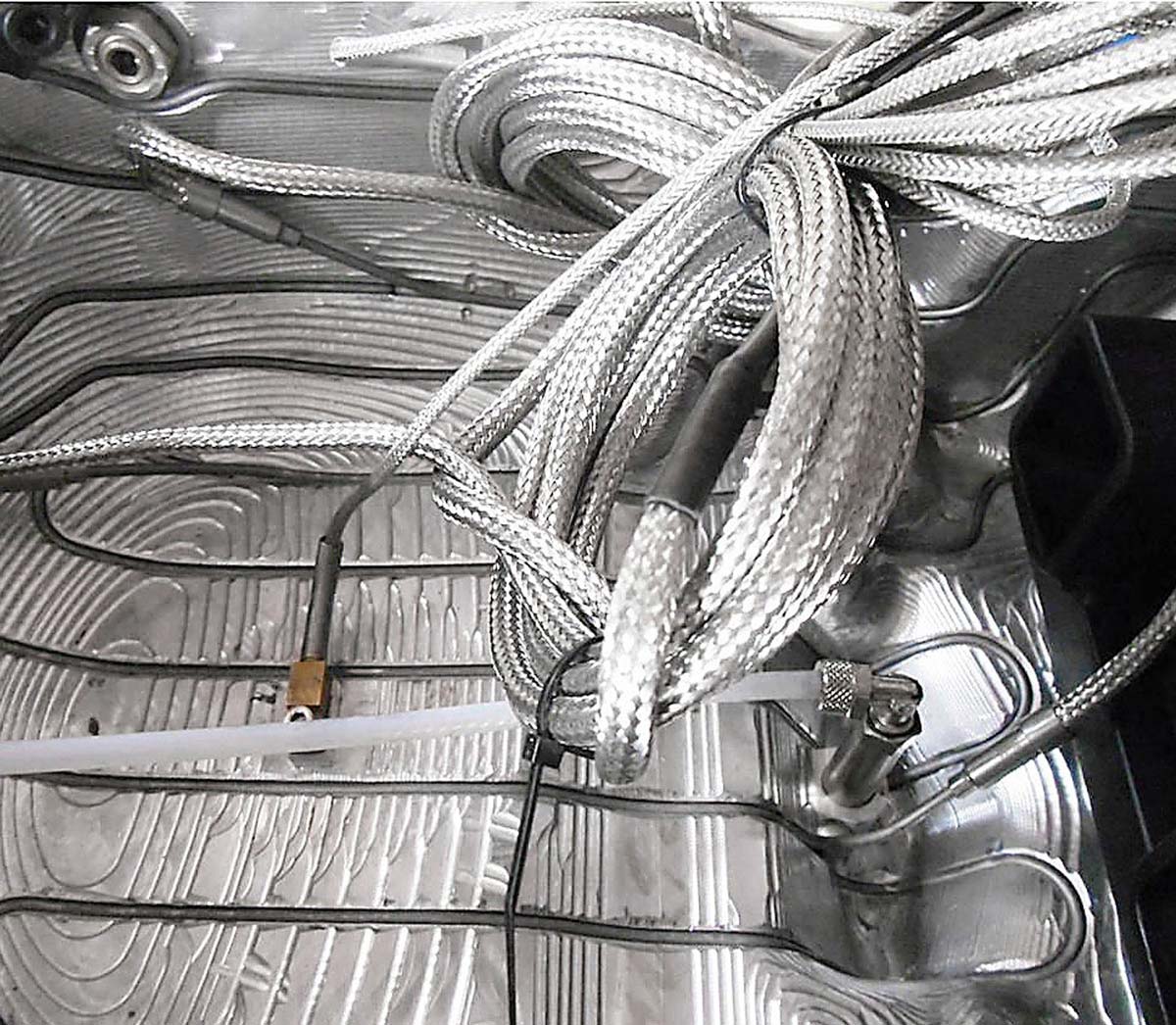 Over the last decade, serious attempts have been made to make the rotomolding process more completely automated and a few speciality machine designs have been developed. These often rely on direct contact heating, either by hot fluid channels cut into the mold wall or by electrical heating elements embedded in the mold wall. An external oven is not required (Fig 9). Benefits of these machines include reduced labor cost, faster cycle times and increased process flexibility. However, the heating modifications make molds relatively expensive, compared to standard molds.