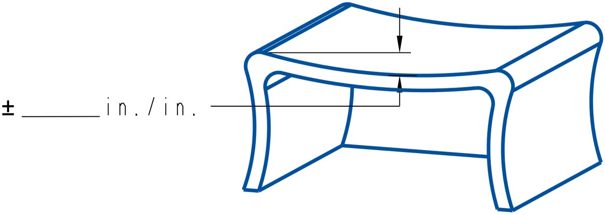 The designer should give consideration to large flat surfaces that have functional or cosmetic attributes. A commercially acceptable flatness tolerance on a polyethylene part would fall in the range of ±0.020 to 0.030 inches per inch (see Fig 15). A precision tolerance of ±.010 inches per inch may be achieved with quality tooling and controlled processing techniques.