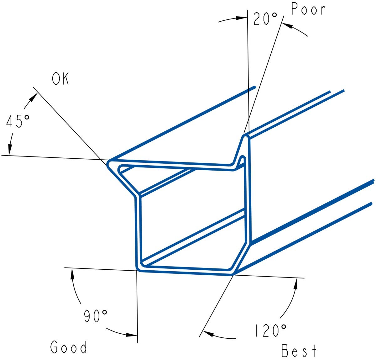 A limiting factor on corner angles is that there must be an adequate radius at their tip, ie the point where the two walls meet. The design guidelines given for “minimum wall separations” and “corner radiuses” also apply to corner angles.