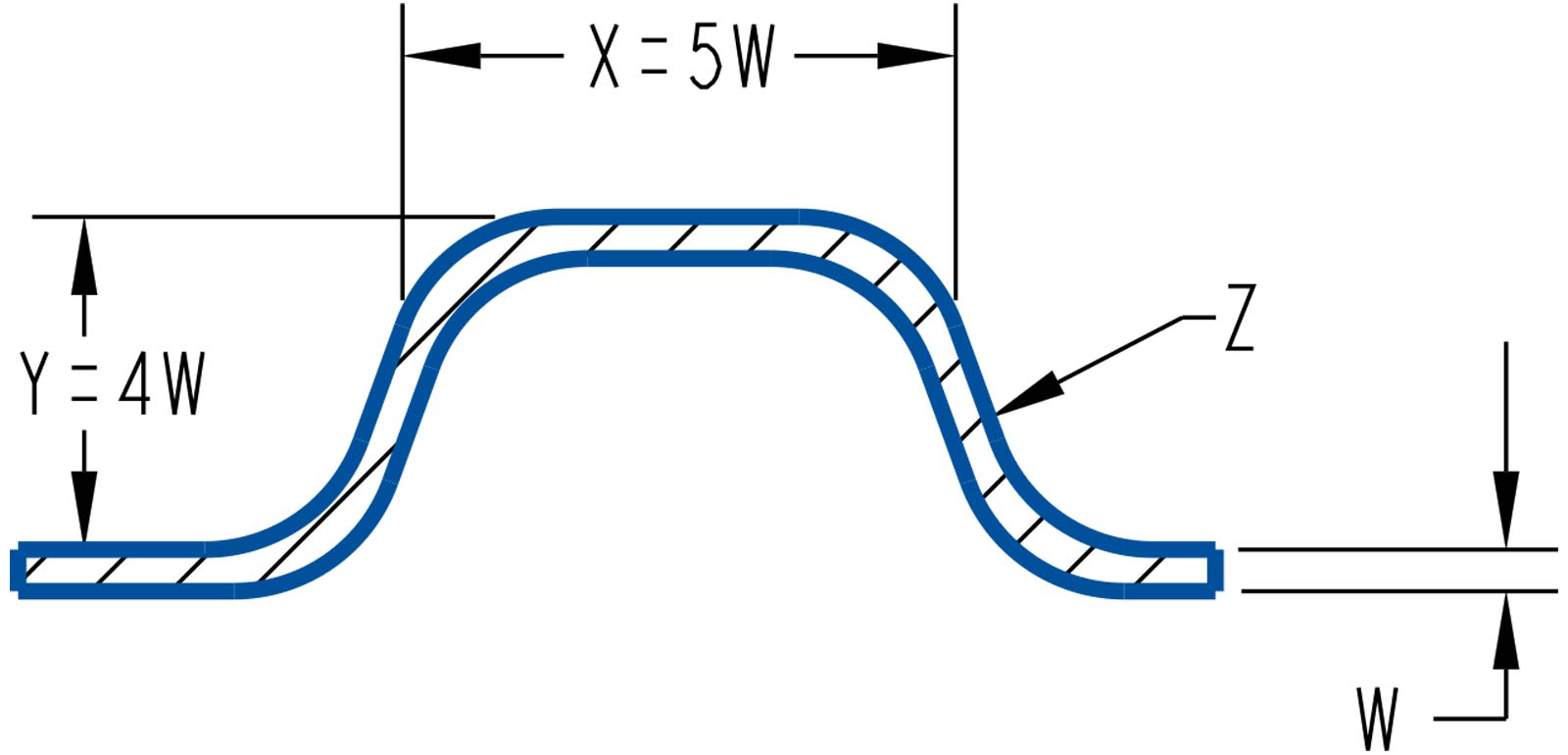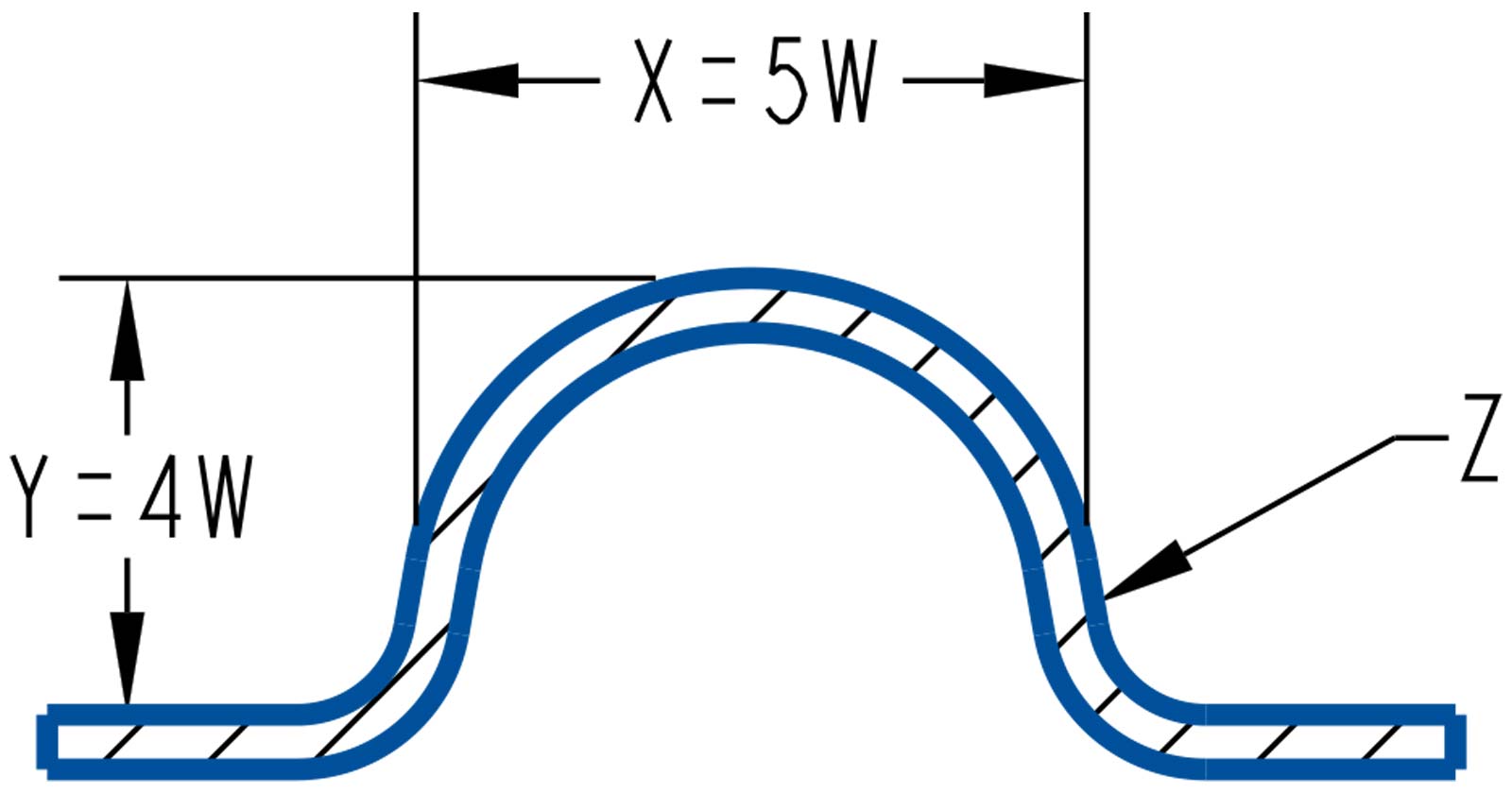 A good average proportion for rotationally molded stiffening ribs would be a width of at least five times the nominal wall thickness and a height of at least four times the nominal wall thickness (Fig 21). As the height of the rib is increased, so will be the stiffness of the structure; this is main factor. A wider rib will increase the probability of proper formation. For best results, the width of the rib should be greater than its height.