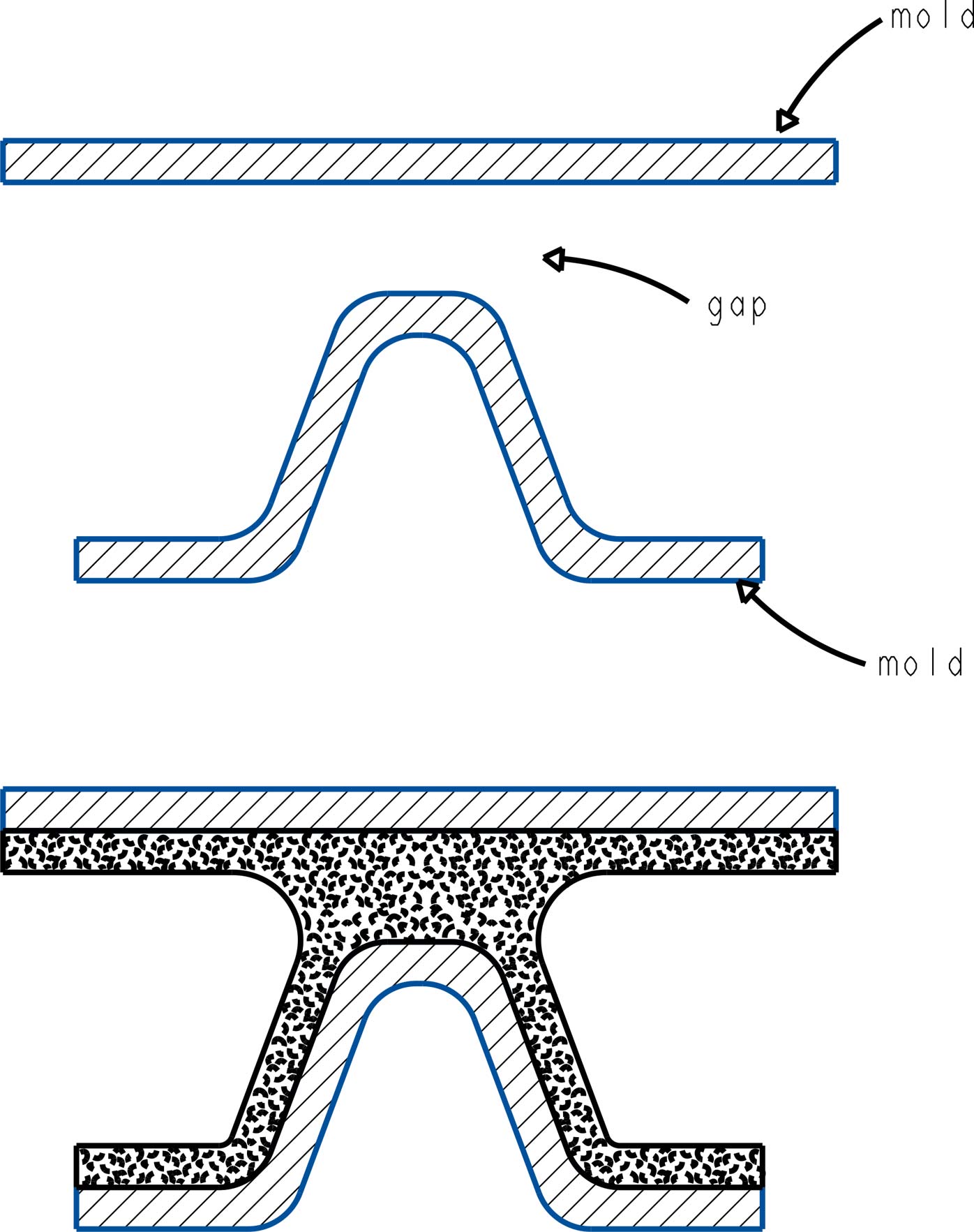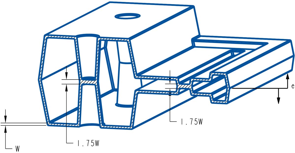 To produce a kiss-off, as a rib or single point, there must be a gap between the kiss-off protrusions on each side of the mold. The size of this gap, relative to the nominal wall thickness, is critical. Too large a dimension will mean that a satisfactory tie cannot be established. Too small a dimension will act as a barrier to powder flowing into the gap and being able to form the tie. In practice, gap dimensions are often established by trial-and-error, or by prior experience. A gap between the two kiss-off points of 175% of the nominal wall thickness is a good starting point (Fig 24). These proportions will provide an adequate weld line, while leaving sufficient space for the powder to move into the gap to form the tie. One common strategy is to make a smaller gap during mold manufacture and then grind off material subsequently in stages, until a satisfactory weld depth has been established.